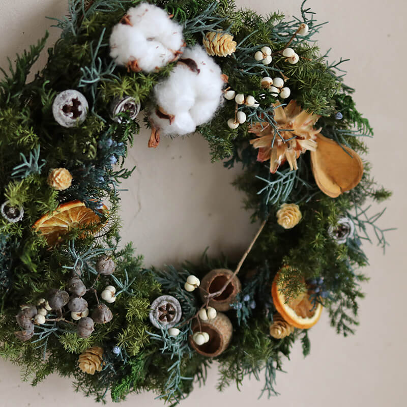 ソフトヒムロスギやジュニパーなどの針葉樹にコットンフラワーやオレンジ、ナンキンハゼの実などをあしらって大人っぽくシックなクリスマスリースに。