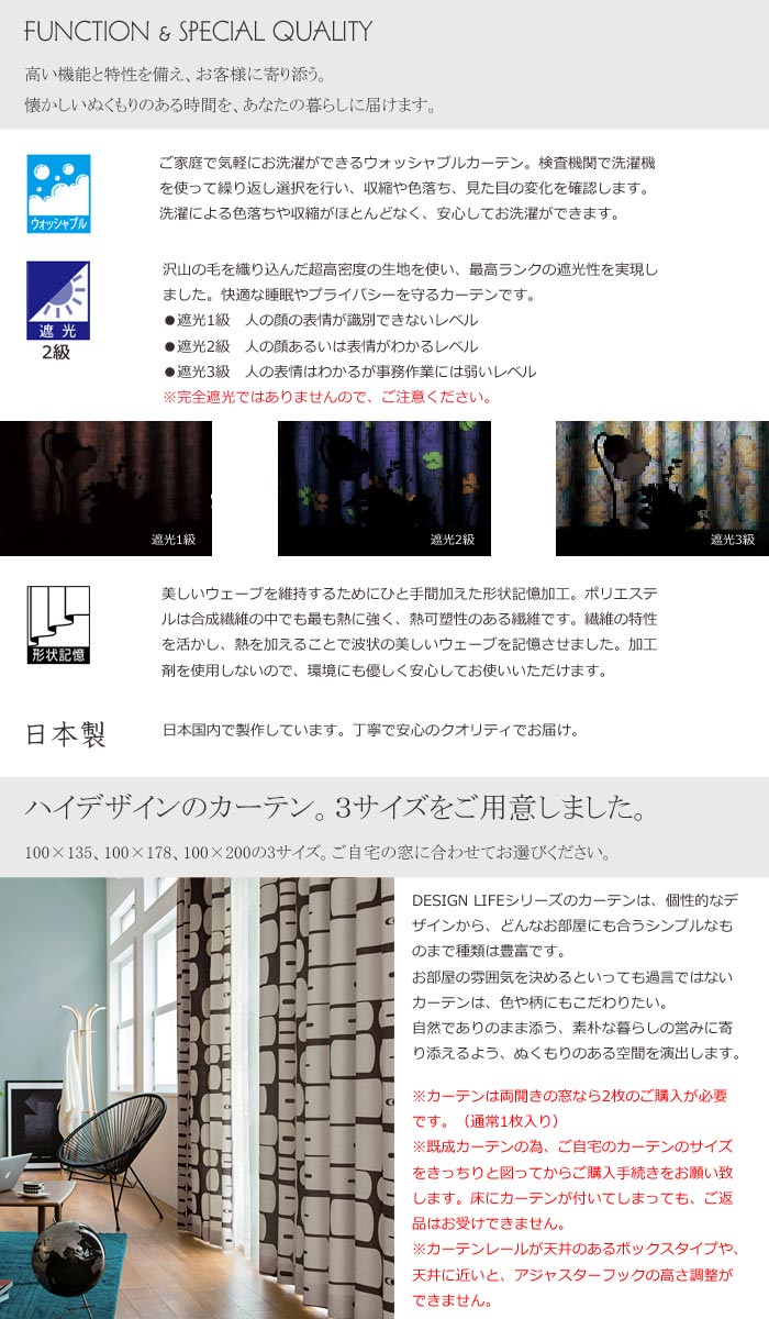 丸ごと洗えるウォッシャブル加工、遮光2級、形状記憶加工。