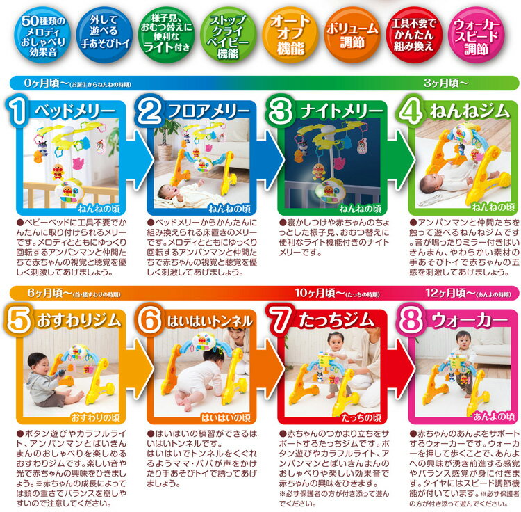 商品詳細 <アンパンマン 8WAY ウォーカーまでへんしん! よくばりメリー> ●メリーからウォーカーまで8つの機能にカンタンに組み替え! 成長に合わせて長く使えます。